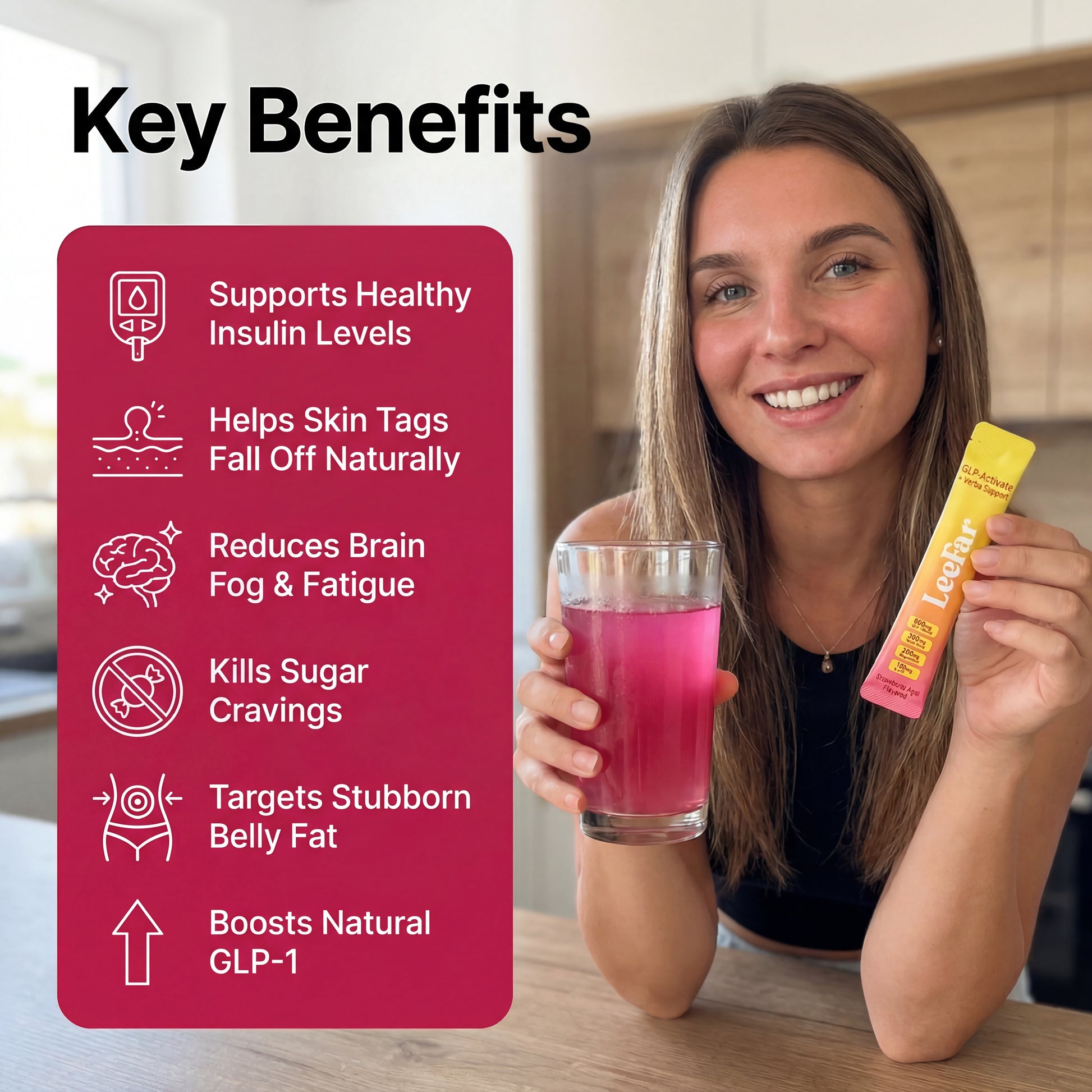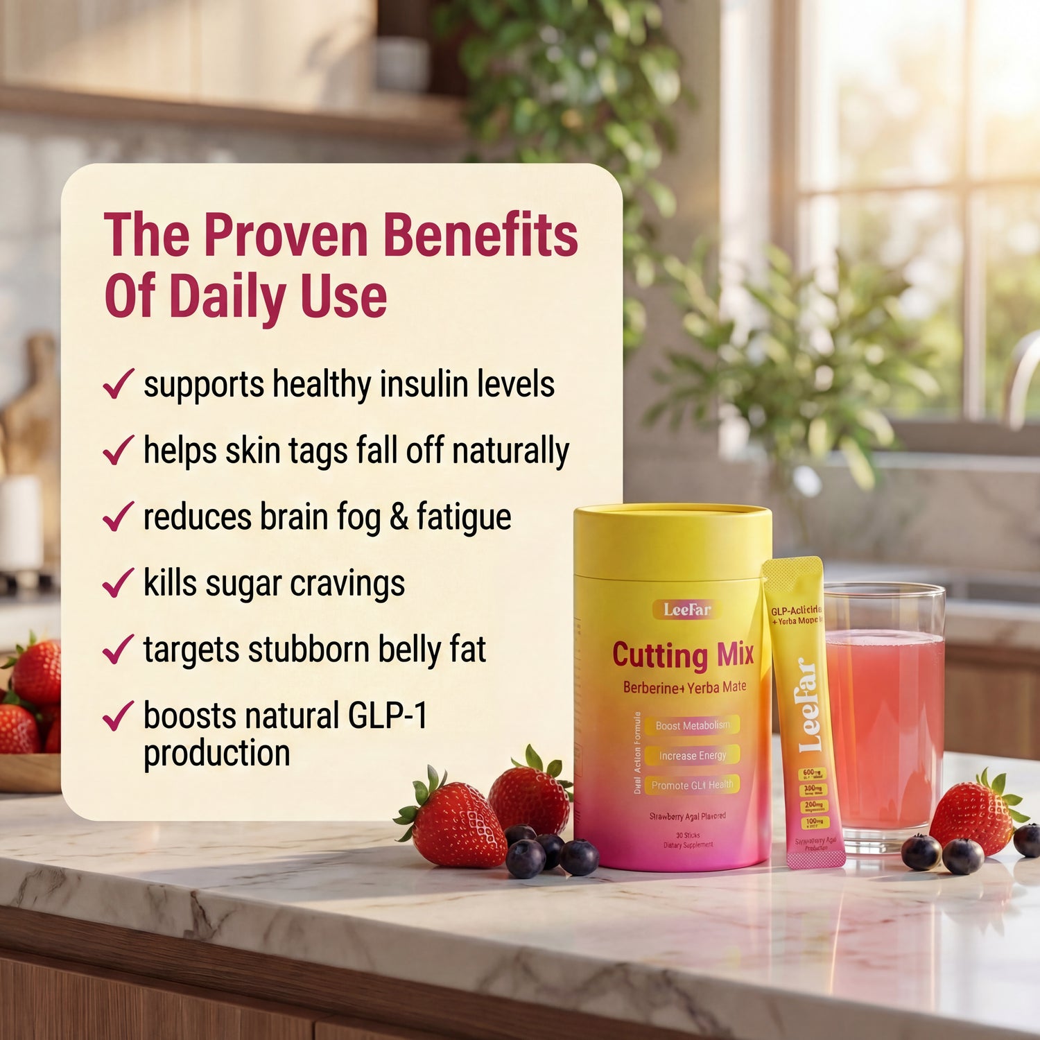 Our LeeFar Cutting Mix is designed to address insulin resistance from the inside using clinically-backed ingredients. It helps regulate blood sugar, kill cravings, and restore insulin sensitivity so skin tags finally fall off naturally, brain fog lifts, energy comes back, and that stubborn belly fat finally starts to budge. And because it tastes like strawberry açai, staying consistent every morning is easy.